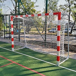Bramki do piłki ręcznej profesjonalne stalowe o wymiarach 3x2 m, profil 80x80 mm, z łukami stałymi, cynkowane ogniowo, przeznaczone do instalacji w tulejach. Rama główna bramki skręcana za pomocą specjalnej złączki znajdującej się w górnym elemencie ramy. Narożniki bramki są zespawane, miejsce łączenia znajduje się na słupku, poniżej narożnika.