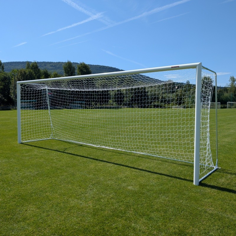 Profesjonalne bramki do piłki nożnej o wymiarach 7,32x2,44 m, z łukami składanymi, rama główna wykonana z profilu aluminiowego 120x100 mm, mocowanie w tulejach osadzonych w podłożu (tuleje w komplecie)