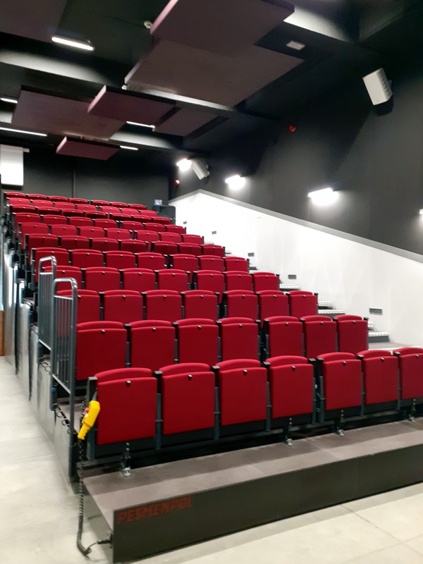 Trybuna teleskopowa 11-rzędowa z napędem elektrycznym, z siedziskami uchylnymi grawitacyjnie tapicerowanymi oraz podestem za trybuną - Kulturoteka w Warszawie