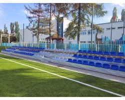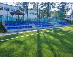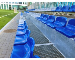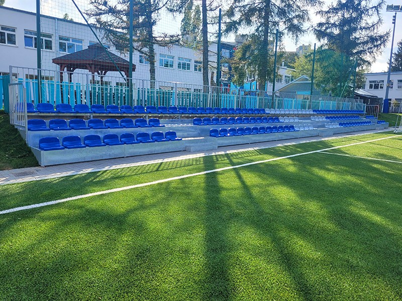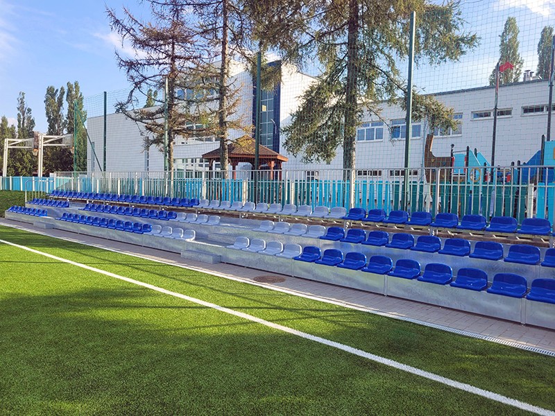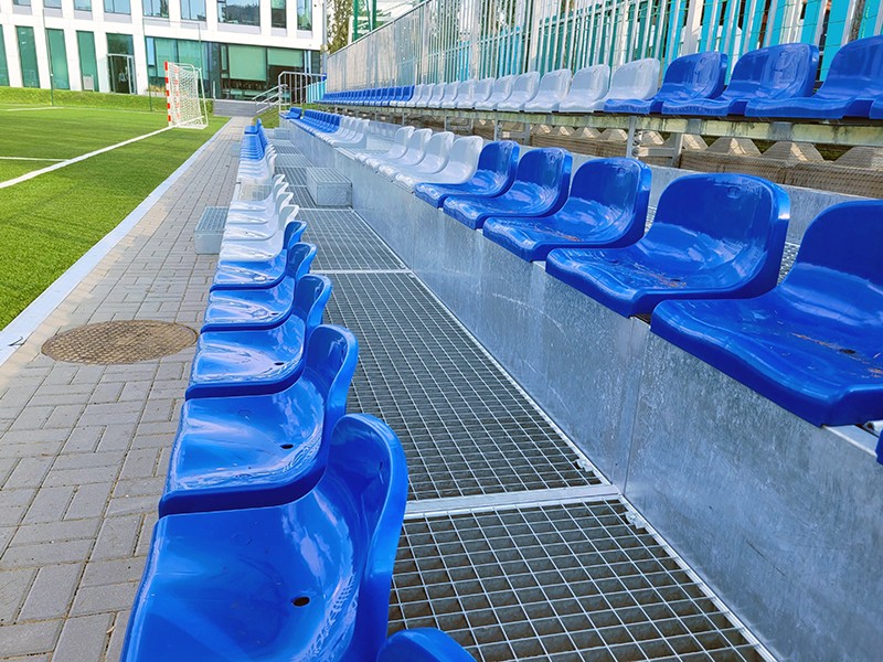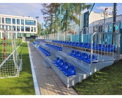 Trybuna o konstrukcji stalowej stała 3-rzędowa, wyposażona w siedziska plastikowe, na boisko sportowe w Warszawie, Polska