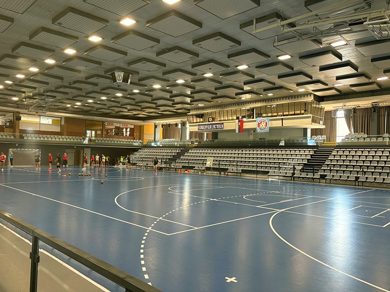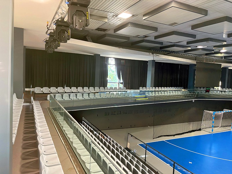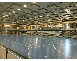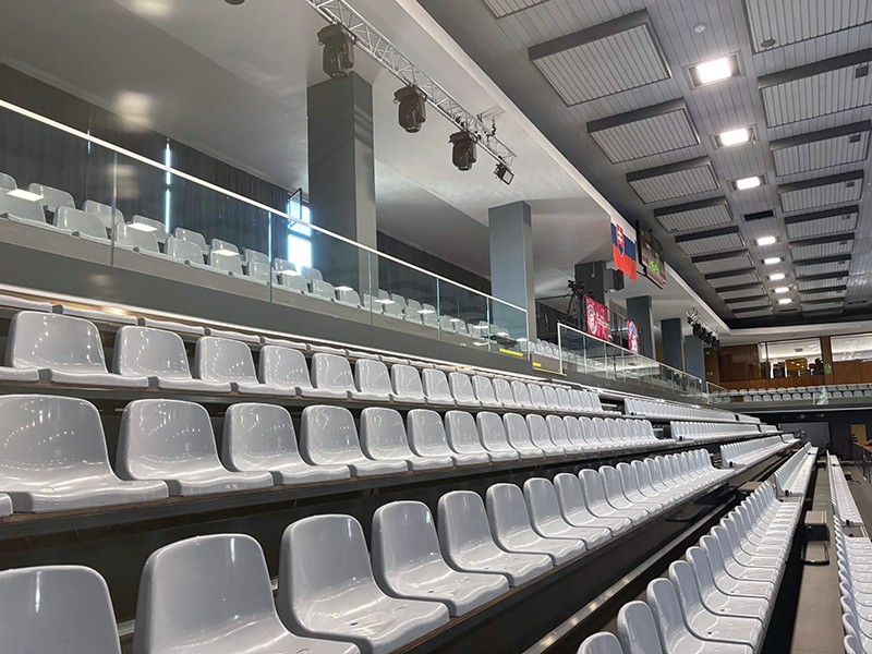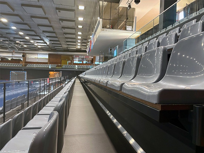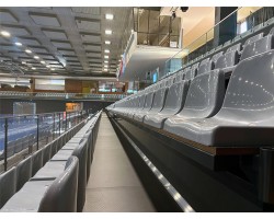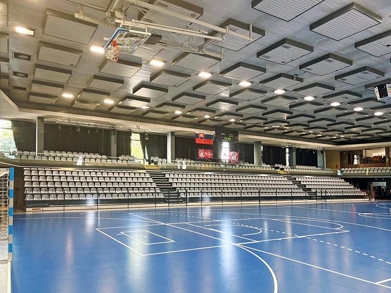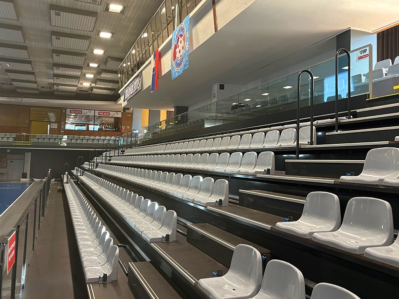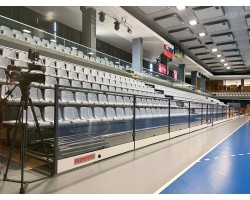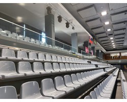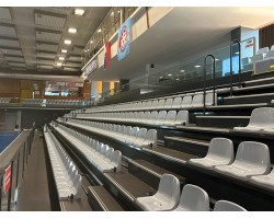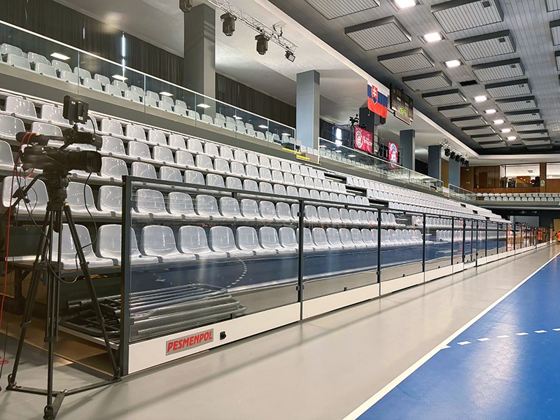 Trybuny teleskopowe 6-rzędowe TTW-400 z napędem elektrycznym i trybuna stała 2-rzędowa TSH-200 oraz siedziska na widownie hali sportowej w m. Trenčín, Słowacja