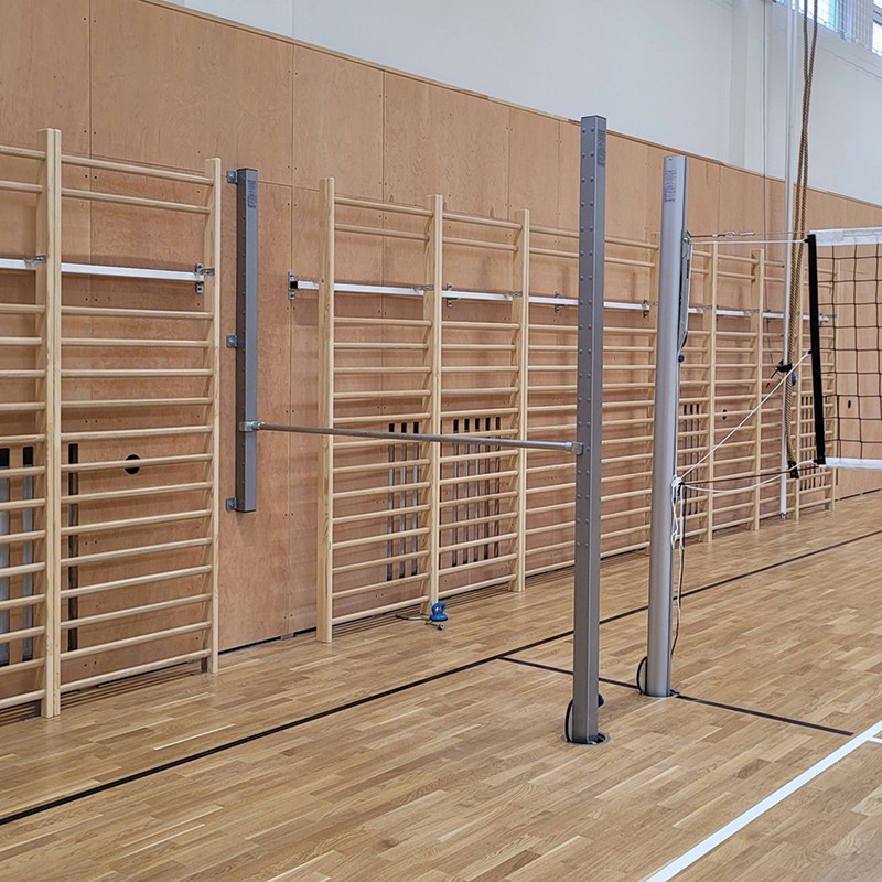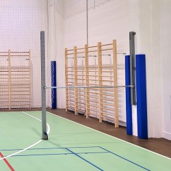 Drążek gimnastyczny przyścienny z jednym polem ćwiczebnym (stalowy drążek z uchwytami wyposażonymi w śruby blokujące mocowany do stalowych słupków 80x80 mm - jeden słupek instalowany w tulei osadzonej w podłożu, drugi zamocowany na stałe do ściany), regulacja wysokości drążka co 10 cm