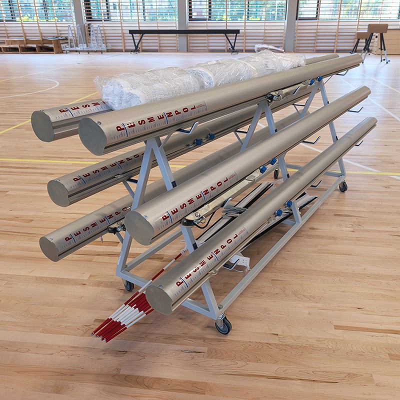 Metalowy malowany proszkowo wózek na ogumowanych kółkach, przeznaczony do transportu do 3 par słupków do siatkówki
