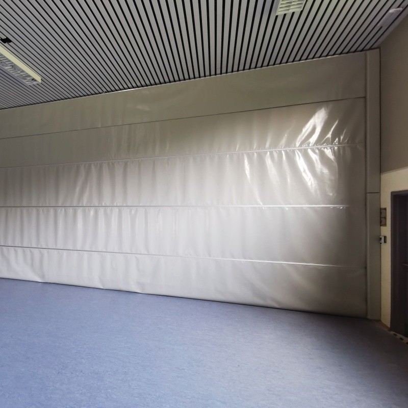 Dwuwarstwowa dźwiękochłonna kotara grodząca wykonana jest z segmentów materiału PVC połączonych ze sobą specjalnymi profilami aluminiowymi.