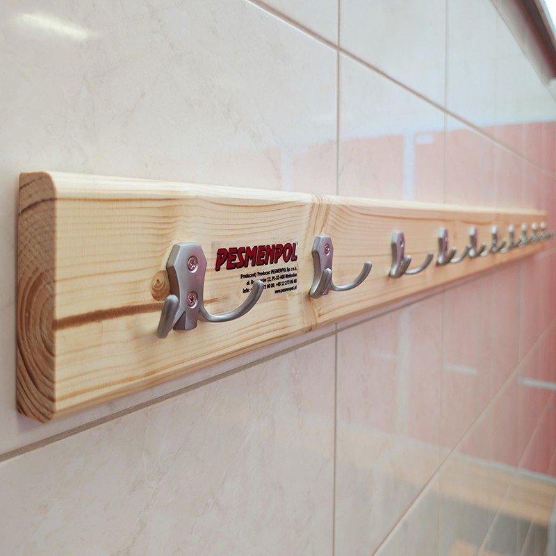 Wieszak do szatni mocowany bezpośrednio do ściany - drewniana lakierowana listwa wyposażona w podwójne haczyki do zawieszania odzieży