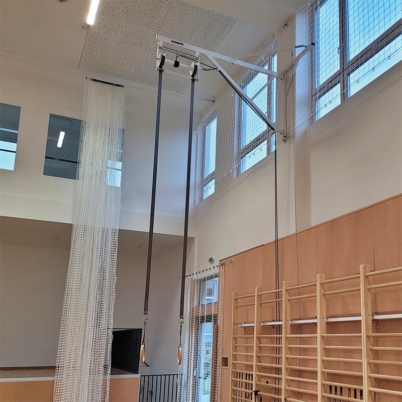 Wysokość zawieszenia kółek gimnastycznych można płynnie regulować w zgodnym z normą zakresie od 100 do 300 cm nad poziomem posadzki. Zarówno regulacja wysokości, jak i system składania i rozkładania konstrukcji jest szybki i bezproblemowy. Wszystko odbywa się za pomocą linek dostępnych dla użytkownika z poziomu parkietu.