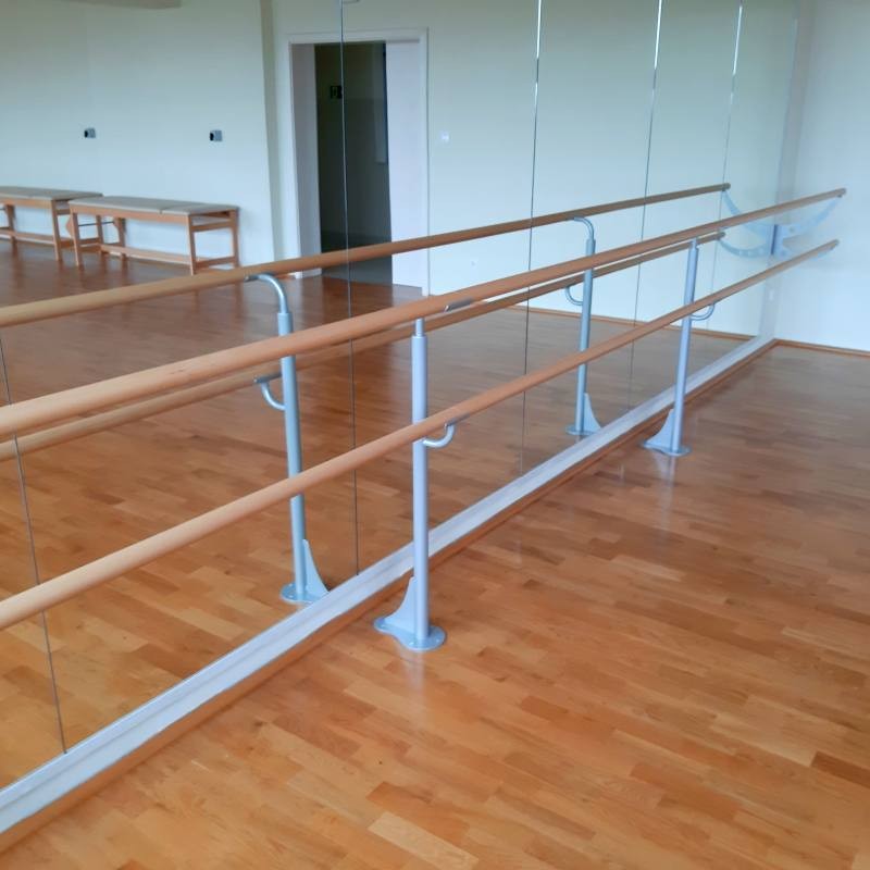 Lustra gładkie przyścienne o grubości 4 mm, mocowane na płycie wiórowej, dostępne w wersjach z pojedynczą albo podwójną poręczą na wspornikach lub bez poręczy, do użytku w salach gimnastycznych, fitness lub tanecznych