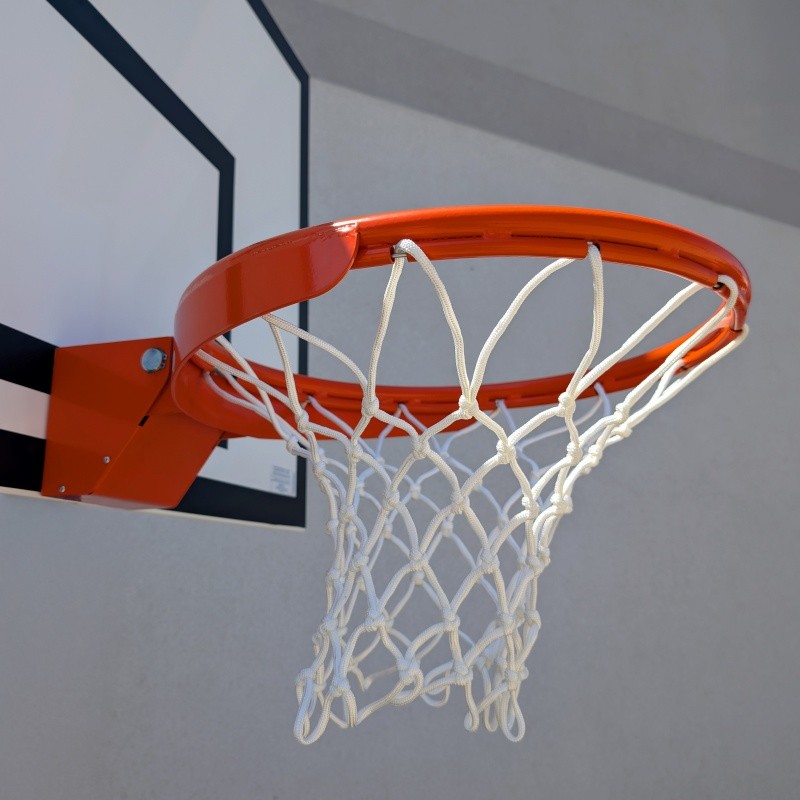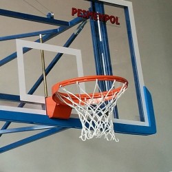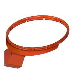 Obręcz do koszykówki uchylna sprężynowa z dodatkowymi wzmocnieniami, malowana proszkowo, przeznaczona do użytku w zamkniętych obiektach sportowych. Siatka mocowana na pręcie