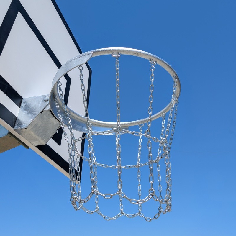 Obręcz do koszykówki uchylna sprężynowa z dodatkowymi wzmocnieniami, cynkowana ogniowo, przeznaczona do użytku na zewnętrznych boiskach boiskach sportowych. 12 uchwytów do mocowania siatki łańcuchowej