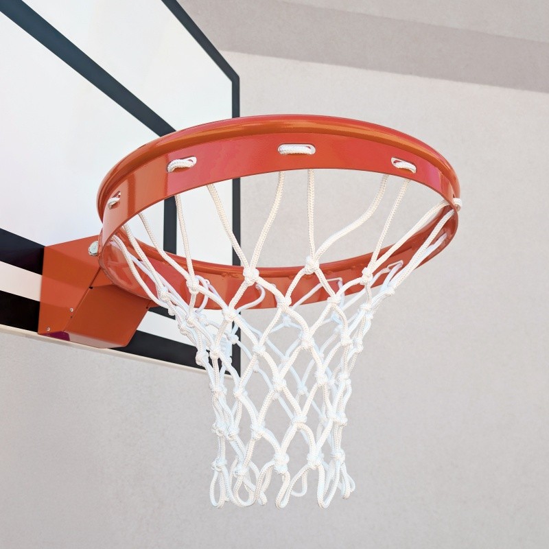 Obręcz do koszykówki uchylna sprężynowa z dodatkowymi wzmocnieniami, malowana proszkowo, przeznaczona do użytku w zamkniętych obiektach sportowych. Kołnierzowy systemem mocowania siatki