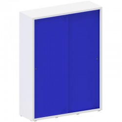 Metalowa szafa na sprzęt sportowy, malowana proszkowo, o wymiarach 200x150x50 cm (HxSxG), z drzwiami przesuwnymi, zamykaną na klucz skrytką, regulowanymi półkami, przegrodą na kije i tyczki, haczykami oraz wanienką.