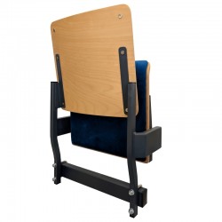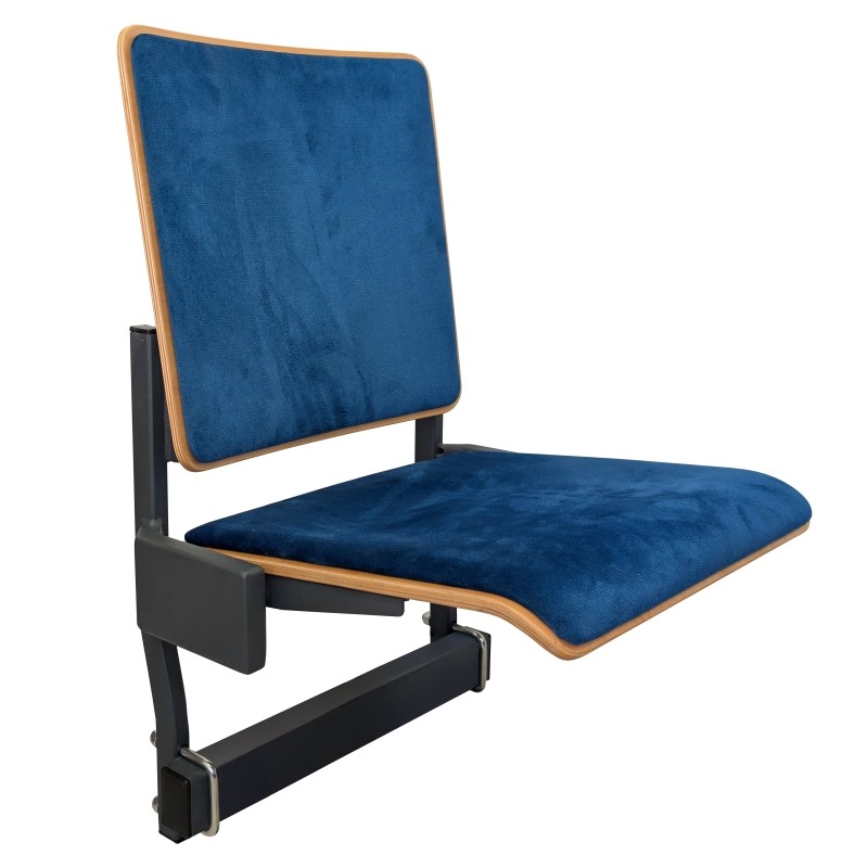 Wygodne składane grawitacyjnie siedzisko audytoryjne, z oparciem i siedziskiem wykonanymi ze sklejki bukowej, zabezpieczonej powłoką lakierniczą i wykończonej nakładką tapicerską