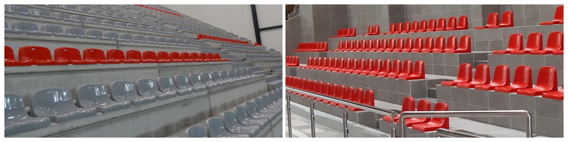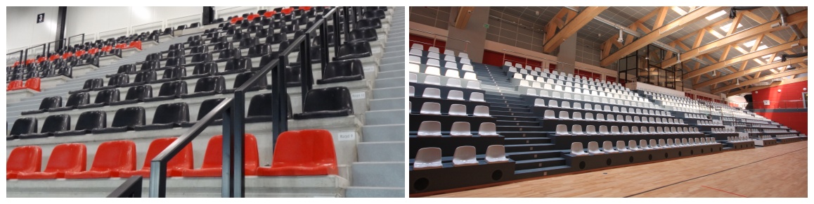 Tworzywowe siedziska jednoczęściowe (kubełkowe) montowane bezpośrednio do stopnia widowni sportowej o konstrukcji betonowej lub stalowej w obiektach zamkniętych