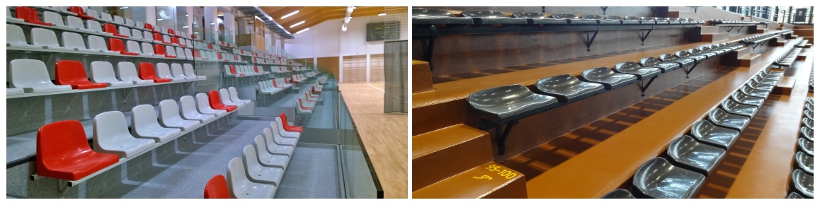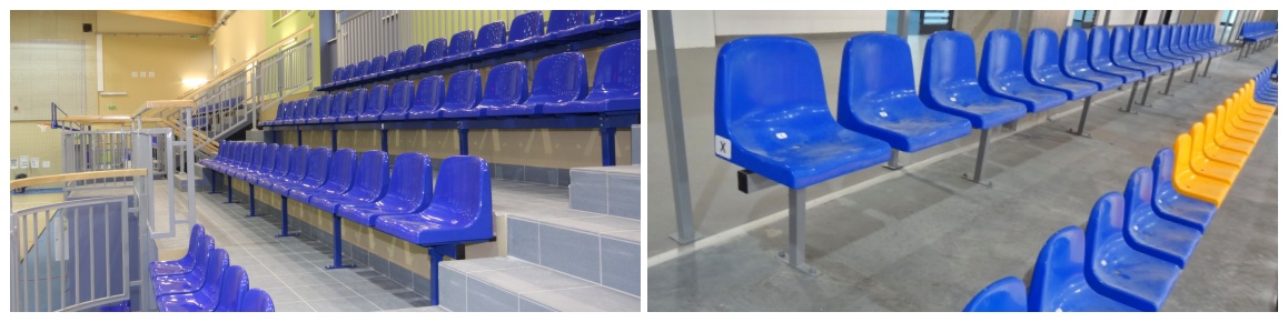 Tworzywowe siedziska jednoczęściowe (kubełkowe) montowane na konstrukcji stalowej malowanej proszkowo do stopnia lub podstopnicy widowni sportowej o stopniach betonowych albo stalowych z podestami z płyt w obiektach zamkniętych