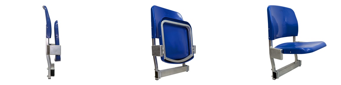Krzesełka sportowe ze składanym grawitacyjnie siedziskiem montowane na konstrukcji stalowej cynkowanej ogniowo do stopnia lub podstopnicy widowni sportowej zewnętrznej o stopniach betonowych albo stalowych z podestami