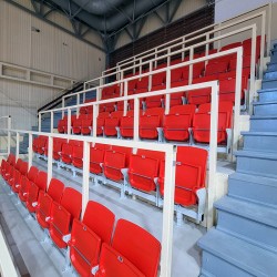 Krzesełka sportowe ze składanym grawitacyjnie siedziskiem montowane na konstrukcji stalowej malowanej proszkowo do stopnia lub podstopnicy widowni sportowej o stopniach betonowych albo stalowych z podestami z płyt w obiektach zamkniętych