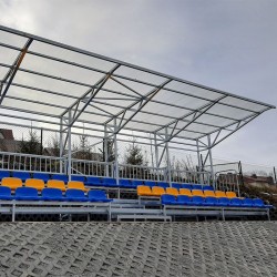 Trybuna stała zadaszona z prostym dachem na boisko zewnętrzne, 2- do 6-rzędowa, z siedziskami plastikowymi i pokryciem z poliwęglanu komorowego.