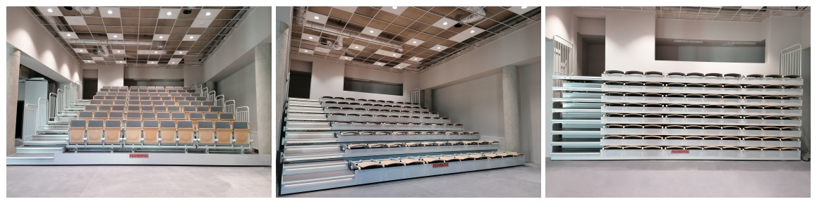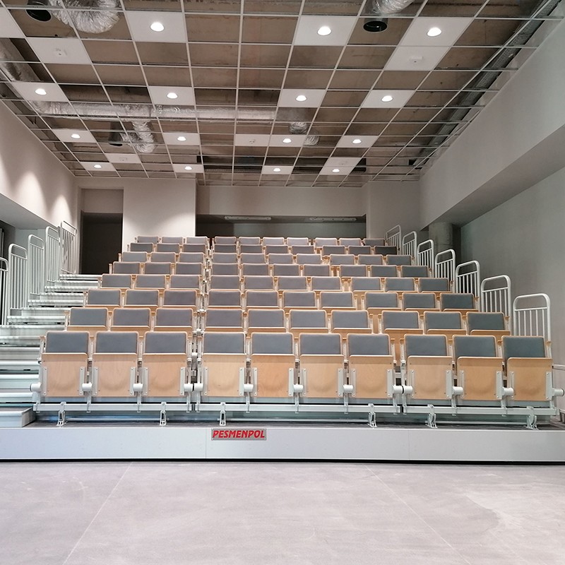 Trybuna teleskopowa składana manualnie lub z napędem elektrycznym, wyposażona w siedziska składane sprężynowo z podłokietnikami, wykonane ze sklejki bukowej z nakładką tapicerską, certyfikowana za zgodność z normami PN-EN