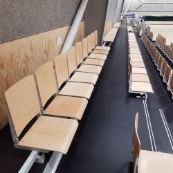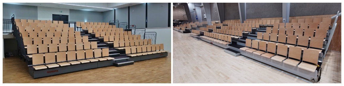 Trybuna teleskopowa składana manualnie lub z napędem elektrycznym, wyposażona w siedziska ze składanym oparciem, wykonane ze sklejki bukowej, certyfikowana za zgodność z normami PN-EN